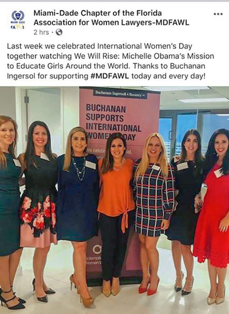 Miami attorneys celebrated International Women's Day by attending Miami-Dade Association for Women Lawyer's (MDFAWL) movie event, watching We Will Rise: Michelle Obama's Mission to Educate Girls Around the World.