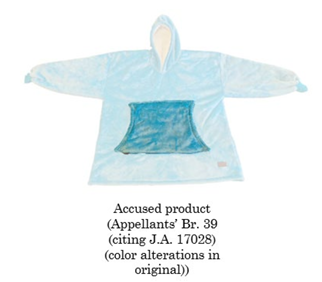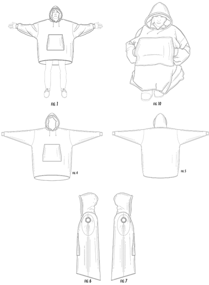 Cozy Comfort obtained U.S. Design Patent No. D859,788 (the ‘788 patent) for an “ENLARGED OVER-GARMENT WITH AN ELEVATED MARSUPIAL POCKET”. The following figures are representative: