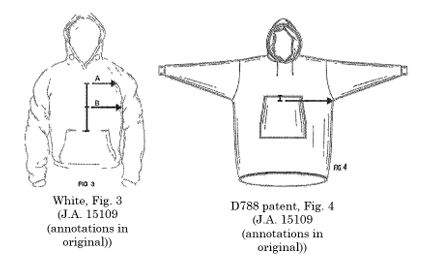 In addition, during examination the patentee also argued the bottoms of the claimed armscyes (i.e., armholes) in its design were “actually below the top of the marsupial pocket,” in contrast to White’s armscyes that were “well above the top of the marsupial pocket,” as shown in the annotated figures below: