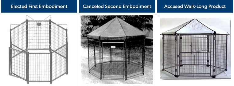Relying on Pacific Coast Marine Windshields Ltd. v. Malibu Boats, LLC, 739 F.3d 694 (Fed. Cir. 2014) in granting dismissal on the pleadings, the District Court noted that Advantek had (1) surrendered the unelected embodiment (i.e., a kennel with a roof cover), (2) that this surrender was for reasons of patentability (i.e., to overcome a restriction requirement), and (3) that the accused Walk-Long design (shown above) was within the scope of the surrendered design.