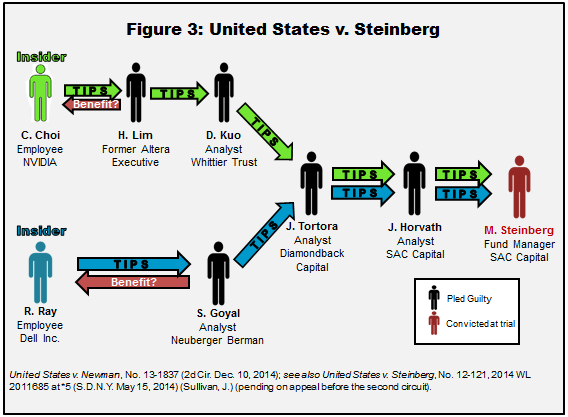 The most obvious impact of Newman will likely be on the related appeal of former SAC Capital Fund Manager Michael Steinberg, currently pending before the Second Circuit. That case arises from essentially the same facts as Newman and presenting virtually identical issues regarding the conviction of a portfolio manager that traded on inside information received through an attenuated chain of tippees.17, 18 (See Figure 3 and compare with Figures 1 and 2)