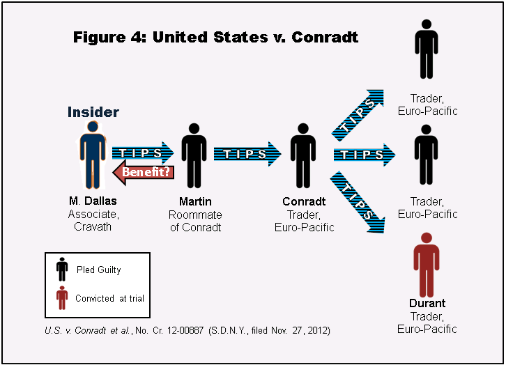 The Conradt defendants included four traders at Euro-Pacific and one of the trader's roommates, an investment banking analyst. The Government alleged that the banking analyst had received the tip from a friend who was an associate at Cravath, Swaine & Moore and who had been working on the IBM deal. After receiving the tip, the banking analyst allegedly passed it along to his roommate, one of the Euro Pacific traders, who then tipped the three other traders, all of whom allegedly traded on the information. (See Figure 4)